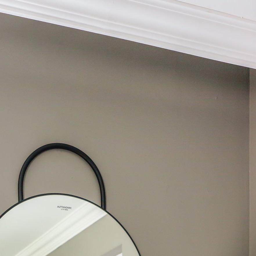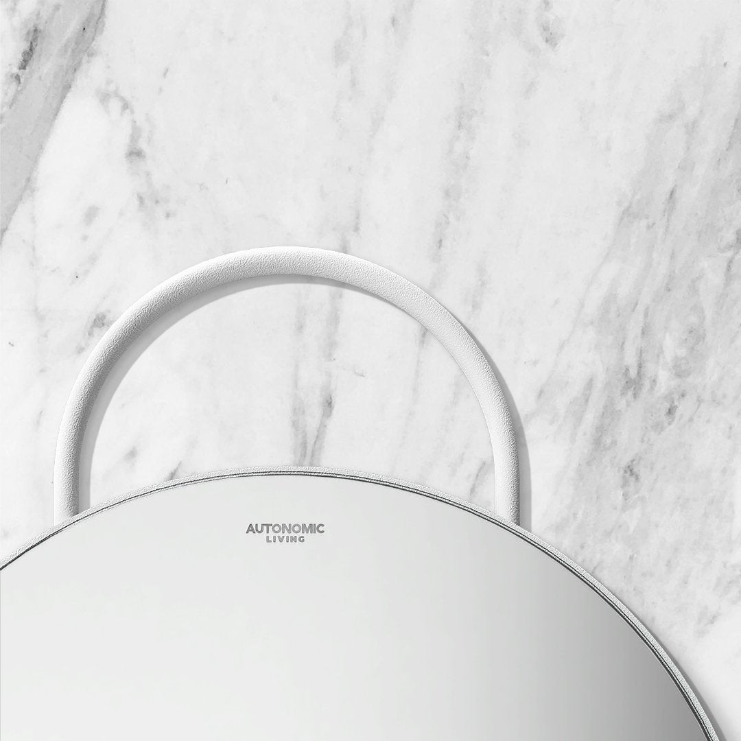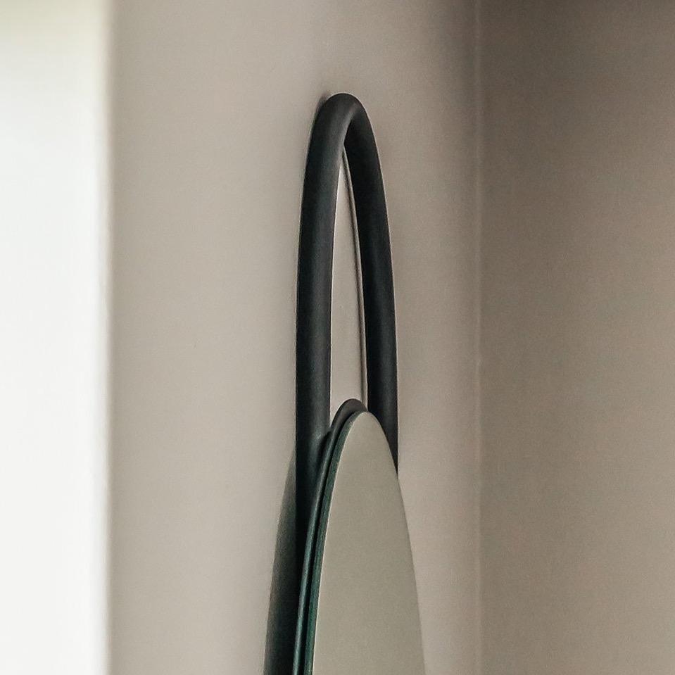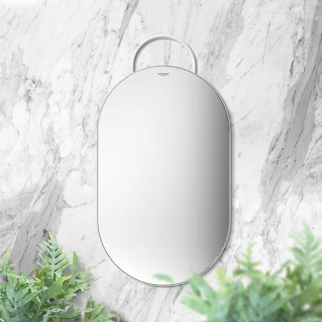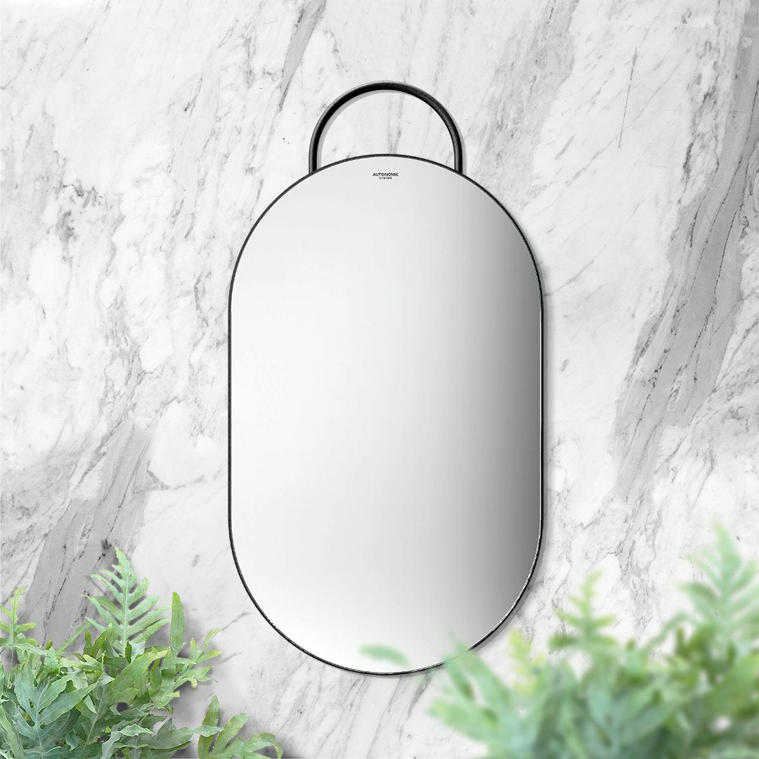 Un miroir flottant en forme de pilule sans cadre avec un support en acier doux revêtu et un support de montage. Un ancrage mural de montage et des instructions sont inclus.